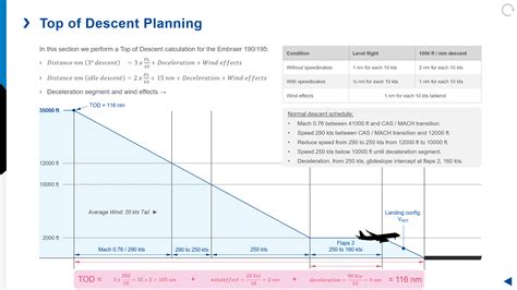 This means you should begin your descent approximately 90 NM from your destination, assuming a standard 3-degree descent profile. Add some extra miles for deceleration. Also, consider wind corrections. For a tailwind, start the descent earlier; for a headwind, start later.