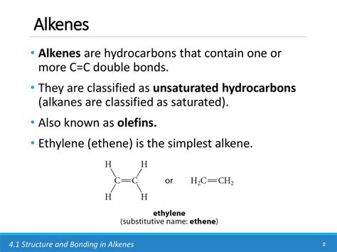 Alright, let’s get down to business. So, what are alkenes? In the simplest terms, alkenes are a class of organic compounds that are characterized by the presence of at least one carbon-carbon double bond . Think of it like this: carbon atoms love to bond with each other to form the backbone of organic molecules. In alkanes, all these bonds are single bonds, making them pretty stable. But in alkenes, things get a bit more interesting because of that double bond. This double bond consists of one sigma ( \(\sigma\) ) bond and one pi ( \(\pi\) ) bond. The pi bond is weaker and more exposed than the sigma bond, which is what makes alkenes way more reactive than their alkane cousins. The general formula for alkenes with just one double bond and no rings is C \(_n\) H \(_{2n}\) , where ‘n’ is the number of carbon atoms. So, for example, if you have two carbon atoms, you’d have C \(_2\) H \(_4\) , which is ethene. Three carbons? C \(_3\) H \(_6\) , propene. Four carbons? C \(_4\) H \(_8\) , butene. You get the picture! This simple formula is a key identifier for these compounds. The presence of this double bond is the defining feature, the hallmark of alkenes , and it’s what gives them their unique chemical properties and opens up a whole world of reactions.