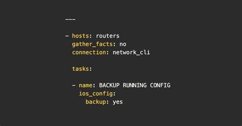 First, you’ll need a playbook. Let’s call it backup_config.yml . This playbook will define the tasks to perform. We’ll use the ansible.builtin.copy module to save the output locally on the Ansible control node. For fetching the configuration, we can use a module like cisco.ios.ios_command (if you’re using Cisco IOS devices) or a more generic ansible.netcommon.network_cli with the command: show running-config . However, a cleaner and more network-centric approach is often to use modules designed for configuration retrieval. For example, cisco.ios.ios_config has a save_when: always parameter, but that’s more for saving to the device’s startup config. For remote backups, we want to fetch it. A common pattern is to use a task that runs a command and registers the output.