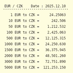 1. Find the current EUR to CZK exchange rate. Let’s say, for example, that the current exchange rate is 1 EUR = 25 CZK.