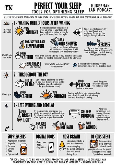 Before we jump into the tools, let’s quickly cover some of the science behind sleep, according to Huberman. He emphasizes the importance of understanding our circadian rhythm, which is basically our internal 24-hour clock that regulates sleep-wake cycles. This rhythm is heavily influenced by light exposure, especially sunlight. According to Huberman , consistent exposure to sunlight, especially in the morning, helps to anchor our circadian rhythm, making it easier to fall asleep and wake up at consistent times. Melatonin, a hormone that promotes sleepiness, is also a key player. Huberman explains that melatonin production is inhibited by light, which is why it’s so important to dim the lights in the evening and avoid screens before bed. Other factors that influence sleep include body temperature, caffeine intake, and stress levels. By understanding these factors, we can start to take control of our sleep and create a more conducive environment for restful nights. Huberman also highlights the importance of sleep duration and sleep quality. Most adults need around 7-9 hours of sleep per night, but the optimal amount can vary from person to person. Sleep quality refers to how deeply and uninterruptedly we sleep. Deep sleep is crucial for physical restoration, while REM sleep is important for cognitive function and memory consolidation. To improve sleep quality, Huberman recommends optimizing factors like sleep environment, pre-sleep routine, and diet. Huberman’s approach is all about understanding the underlying mechanisms of sleep and using science-backed strategies to optimize them. This empowers us to take a proactive approach to our sleep and create lasting improvements in our overall health and well-being. By paying attention to light exposure, melatonin production, body temperature, and other key factors, we can unlock the secrets to a better night’s rest and wake up feeling refreshed and energized. So, let’s dive into the specific tools and techniques that Huberman recommends for optimizing our sleep.