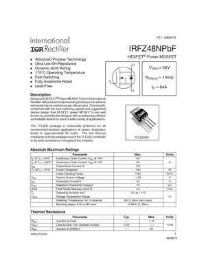• On-Resistance (RDS(on)) : This is the resistance between the drain and source when the MOSFET is fully turned on. Lower on-resistance means less heat generated and better efficiency. The IRFZ48N typically has an RDS(on) of around 0.014 ohms. Try to find an equivalent with a similar or lower RDS(on) for optimal performance. The lower the on-resistance, the less power is wasted as heat, leading to improved overall system performance. If you are aiming for high-efficiency operation, a low on-resistance is a must.