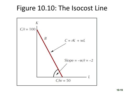 The slope of the isocost line is a critical element because it tells us the relative price of labor compared to capital. A steeper slope indicates that capital is relatively more expensive than labor, while a flatter slope indicates the opposite. Mathematically, the slope is calculated as the negative ratio of the wage rate (w) to the rental rate of capital ®, as we discussed above. The slope represents the rate at which a firm can substitute between labor and capital while keeping the total cost constant. For example, if the slope is -2, it means that the firm can employ two units of labor for every one unit of capital it gives up, without changing the total cost.
