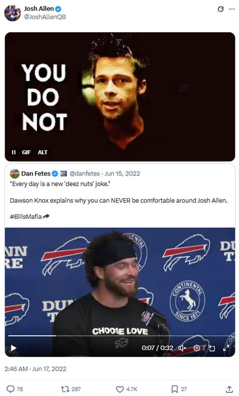 While the “Deez Nuts” meme is undoubtedly hilarious and has become a signature element for Josh Allen , it’s also more than just a joke. For many fans, it has evolved into a symbol that represents Allen’s fearless personality and his willingness to be himself . He’s not afraid to have fun, to embrace the absurdity, and to connect with his fanbase on a more human level. In a league often characterized by serious athletes and carefully crafted public images, Allen’s embrace of something as silly as “Deez Nuts” makes him incredibly relatable and likable. It shows a player who doesn’t take himself too seriously, even as he performs at an elite level. This authenticity is what resonates. It’s the same kind of spirit that makes him an electrifying player on the field – he plays with passion, he’s unpredictable, and he’s always willing to go for it. The meme, in a way, mirrors his playing style: bold, often surprising, and always entertaining. It’s a reflection of his confidence and his ability to shrug off pressure with a dose of humor. When Allen is out there making incredible plays, throwing deep bombs, or running over defenders, the “Deez Nuts” meme feels like a fitting, if unconventional, soundtrack to his dominance. It signifies that he’s playing with joy and a carefree attitude that makes him an absolute joy to watch. It’s this blend of elite athleticism and genuine personality that has endeared him to fans not just in Buffalo but across the league, even if they’re not part of the Bills Mafia. He’s become a personality as much as a player, and this meme is a key part of that narrative, showing he’s a guy who can deliver on the field and also bring a smile to your face with a well-timed, albeit crude, punchline. It’s a unique combination that sets him apart in the modern NFL.