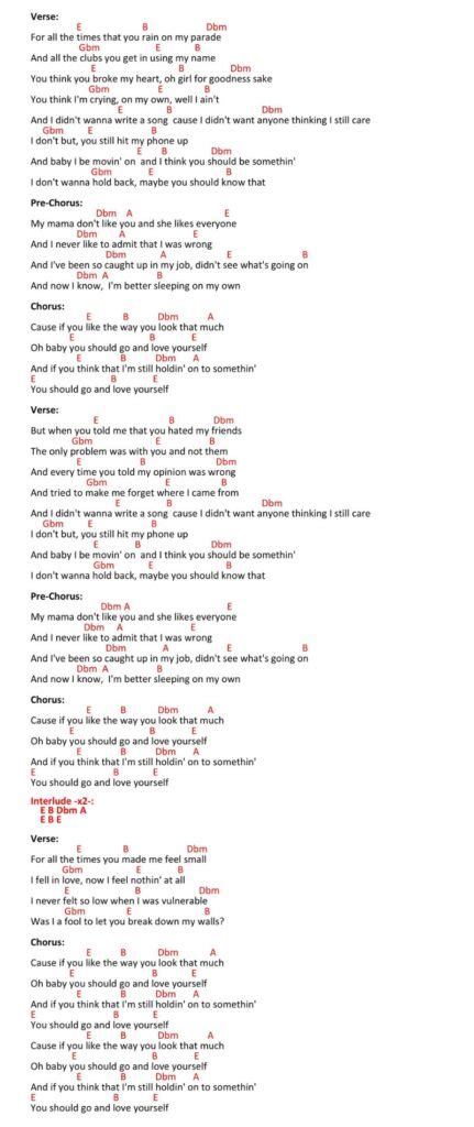 Let’s get even more specific. The song typically starts with G . You’ll then transition to D , followed by Em , and finally C . This entire sequence forms the basic verse and chorus structure. Repeat this sequence throughout most of the song. Understanding how these chords relate to each other in the key of G major will deepen your musical understanding. The G major chord is the tonic, providing a sense of resolution. D major is the dominant chord, creating a sense of anticipation that leads back to the G. Em is the relative minor, adding a touch of emotion. And C major is the subdominant, providing a pleasant contrast. Knowing the relationship between these chords is useful not only for ‘Love Yourself’ but for understanding many other songs in the same key. This understanding will help you to recognize similar chord patterns and even create your own music. You’ll be able to analyze songs more easily and figure out their structures. So, keep practicing the chord progression, and you’ll soon be able to play along with the song from start to finish!