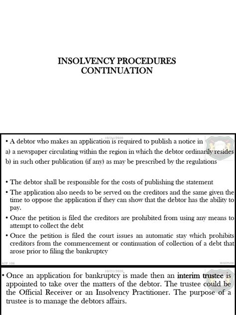 When we talk about individual insolvency procedures in Malaysia , we’re mainly referring to what used to be known as bankruptcy. The Insolvency Act 1967 outlines these procedures. If a person owes more than RM50,000 (this amount can change with legislative updates, so always check the latest figures, guys!) and is unable to pay their debts, a creditor can file a bankruptcy notice against them. Alternatively, an individual can voluntarily file for bankruptcy if they realize they are in an insurmountable debt situation. Once a bankruptcy order is made, the individual becomes a bankrupt. Their assets, with some exceptions like essential household items and tools of trade, are handed over to a Director General of Insolvency (DGI), formerly known as the Official Assignee. The DGI then manages and sells these assets to distribute the proceeds among the creditors. The bankrupt individual is subject to certain restrictions, such as needing permission to travel abroad or engage in certain business activities. The goal here is to provide an orderly process for creditors to recover some of their losses, while also offering the bankrupt a potential path to discharge and a fresh start after a certain period, typically five years, provided they cooperate with the DGI and fulfill their obligations. It’s a pretty structured system designed to deal with overwhelming personal debt. The process isn’t designed to be punitive forever; it’s about managing the situation and eventually allowing for rehabilitation. It’s crucial for individuals facing such situations to seek professional advice early on to understand their rights and obligations throughout the bankruptcy process. Ignoring the problem will only make things worse, trust me. The DGI plays a pivotal role, acting as a trustee for the creditors and managing the bankrupt’s estate. They are responsible for investigating the bankrupt’s affairs, identifying assets, and making distributions. The discharge from bankruptcy, which allows the individual to be free from their debts, is a key part of the process, offering that much-needed second chance. There are conditions for discharge, and failure to comply with the DGI’s requirements can delay or even prevent it. So, it’s not just about filing; it’s about actively participating in the process.