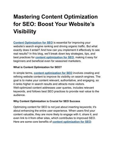 Content optimization isn’t just a fancy phrase, guys; it’s the absolute backbone of any successful search engine optimization (SEO) strategy in today’s digital landscape. Seriously, if you’re putting out content without truly optimizing it, you’re essentially shouting into the void, hoping someone might hear you. But in the vast, noisy online world, hope isn’t a strategy. Effective content optimization ensures your voice is not just heard, but amplified , reaching the right audience at the right time. Think about it: every blog post, every product description, every landing page – these are all opportunities to rank higher, attract more traffic, and ultimately, convert visitors into loyal customers. It’s about making your content not only valuable to your readers but also irresistible to search engines like Google. When your content is optimized, it tells Google exactly what it’s about, making it easier for the algorithm to understand its relevance and serve it up to users who are actively searching for that very information.