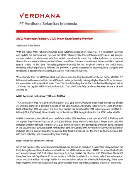 Alright, first things first, let’s talk about the MSCI Indonesia Index . What exactly is it? MSCI stands for Morgan Stanley Capital International, and they’re a big deal in the world of financial market indices. Think of indices like a snapshot or a scorecard for a particular market or sector. The MSCI Indonesia Index, specifically, is designed to track the performance of large and mid-cap stocks in Indonesia. It’s one of the most widely recognized benchmarks for Indonesian equities, giving investors a way to gauge the health and direction of the country’s stock market. Why is this so important, you ask? Well, these indices are used by fund managers, institutional investors, and even retail investors to make decisions. They serve as a basis for many investment products like Exchange Traded Funds (ETFs) and mutual funds. So, if an index goes up, it generally means the market it represents is performing well, and vice versa. The composition of the index is crucial. MSCI uses a strict methodology to select companies, focusing on factors like market capitalization, liquidity, and industry representation. This ensures that the index is a reliable and accurate reflection of the Indonesian equity landscape. It’s not just about picking random stocks; it’s about building a representative portfolio that truly captures the essence of the market. The MSCI Indonesia Index, therefore, becomes a critical tool for understanding investment opportunities and risks within Indonesia. It helps international investors assess the attractiveness of the Indonesian market and allows local investors to benchmark their own portfolios against the broader market performance. The transparency and rigorous methodology behind MSCI indices lend them significant credibility, making them a go-to reference for global financial professionals. So, when you hear about the MSCI Indonesia, remember it’s the key indicator that shows how the top Indonesian companies are doing on the stock market, and it plays a huge role in how money flows into and out of the country’s financial system. It’s like the pulse of the Indonesian stock market, and everyone watches it!