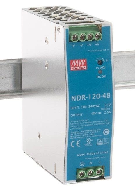 • What is the output voltage and current of the NDR-120-48? It provides a 48V DC output with a maximum current of 2.5A. Always check the datasheet for the exact figures.