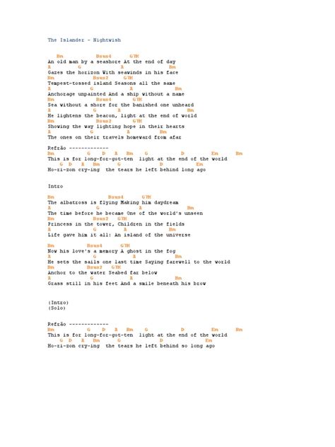 Now, let’s talk about the part that really makes you want to sing along at the top of your lungs: the chorus . The bridge also offers a significant shift in dynamics and harmony. While the verse sticks to that solid Em - G - D - Am loop, the chorus often elevates things. A common progression you’ll hear in the chorus builds on this foundation but introduces a bit more intensity. It might sound something like G - D - Em - C . This shift from the verse’s minor-key feel to a more major-key influenced chorus gives it that anthemic quality. The G and D chords open things up, making it feel bigger and more expansive. Then, dropping back into Em provides a touch of the song’s underlying melancholy, but the C major chord offers a powerful resolution or a different kind of emotional color before potentially heading back to G. This G - D - Em - C progression is incredibly effective for creating a sense of release and catharsis. It’s what makes you want to air guitar and belt out the lyrics. The bridge section often provides a different harmonic flavor altogether, sometimes introducing chords that are a bit further afield or playing with a different rhythmic feel to create contrast. For example, the bridge might venture into something like C - G - D - Em or similar variations, offering a temporary departure from the main themes before returning. The key here is the dynamic contrast . The chorus is designed to be bigger, louder, and more emotionally resonant than the verses. The bridge is there to provide a musical breather or a different perspective before the song launches back into its main themes or a final, powerful chorus. When playing the chorus, don’t be afraid to strum harder, use more open voicings if possible, and really emphasize the downbeats to give it that driving, epic feel. The transition from the verse’s Am to the chorus’s G can be a significant lift. Similarly, the movement from Em to C in the chorus offers a distinct emotional shift. Nightwish are masters of arrangement, and these chord choices are no accident; they are carefully crafted to maximize the emotional impact of each section. Understanding these shifts is vital to capturing the essence of “The Islander.” It’s not just about the notes; it’s about the feeling, the dynamics, and the journey the music takes you on. So, crank it up and feel the power of these chorus and bridge progressions!