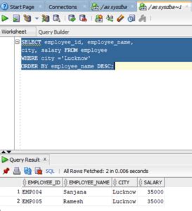 Explanation: In this query, Oracle first sorts all the rows by department in ascending alphabetical order (A to Z). So, all ‘Accounting’ employees will come before ‘Marketing’, and ‘Marketing’ before ‘Sales’, and so on. Within each of those departments, it then sorts the employees by salary in descending order. This means the highest-paid person in ‘Accounting’ will appear first within the ‘Accounting’ block, followed by the next highest, and so on. The ASC for department is optional here since it’s the default, but explicitly stating it can improve clarity. The DESC for salary is essential for getting the highest earners first within each group.