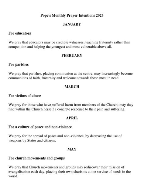 Alright, let’s get into the specifics! Here’s a breakdown of Pope Francis’ intentions for each month of 2023. Keep in mind that these intentions can sometimes be broad, so I’ll break them down into actionable ideas. It’s like having a cheat sheet for how to make the world a better place, one month at a time!