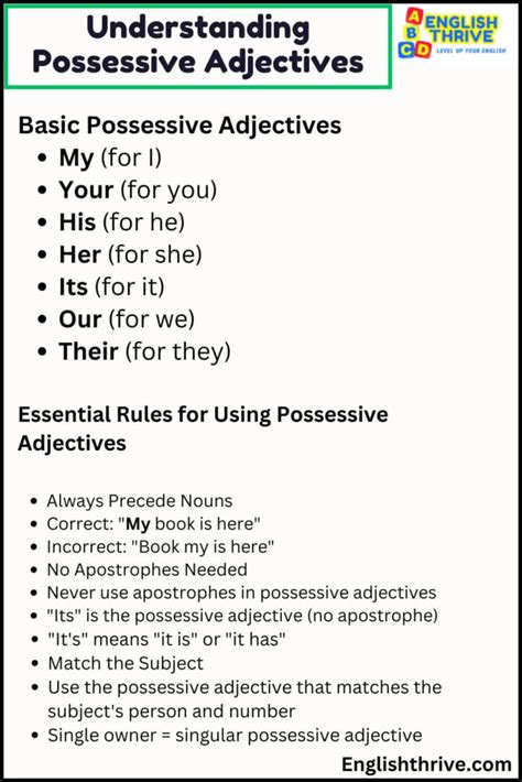 By following these tips, you’ll be able to use possessive adjectives correctly and confidently in your writing and speech. Remember, practice makes perfect, so don’t be afraid to use them as much as possible!