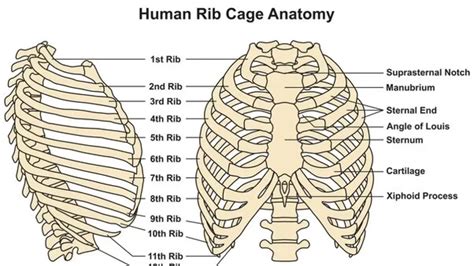 The rib cage anatomy is a fascinating framework composed of several key elements working together to provide protection and support. At the core of the rib cage are the 12 pairs of ribs. These ribs are long, curved bones that extend from the spine in the back to the sternum (breastbone) in the front. But it’s not that simple; these ribs are classified into three categories: true ribs, false ribs, and floating ribs. The first seven pairs are called true ribs. These guys directly attach to the sternum via costal cartilage. This direct connection provides a solid anchor, allowing for effective protection of the organs underneath. The next three pairs, ribs 8 through 10, are termed false ribs. Instead of directly attaching to the sternum, they connect to the costal cartilage of the rib above them. This indirect connection adds a layer of flexibility to the lower part of the rib cage. Finally, the last two pairs, ribs 11 and 12, are the floating ribs. These ribs are unique as they only attach to the spine and do not connect to the sternum or any cartilage in the front. This provides more flexibility in the lower torso, allowing for movements like bending and twisting. Beyond the ribs themselves, the sternum plays a pivotal role. The sternum is a flat bone located in the center of the chest. It consists of three parts: the manubrium (the upper part), the body (the middle and largest part), and the xiphoid process (the small, cartilaginous extension at the bottom). These parts fuse together during adulthood. The costal cartilages, made of hyaline cartilage, connect the ribs to the sternum (except for the floating ribs). These cartilages contribute to the flexibility of the rib cage, enabling it to expand and contract during breathing. The thoracic vertebrae in the spine form the posterior anchor points for the ribs. Each rib articulates with a specific vertebra, creating a strong and stable connection. All these components—ribs, sternum, cartilage, and vertebrae—integrate seamlessly to form the rib cage. This bony and cartilaginous structure not only safeguards vital organs such as the heart and lungs but also aids in the mechanics of breathing. Understanding this anatomy is crucial for appreciating its functions and addressing potential issues that may arise.