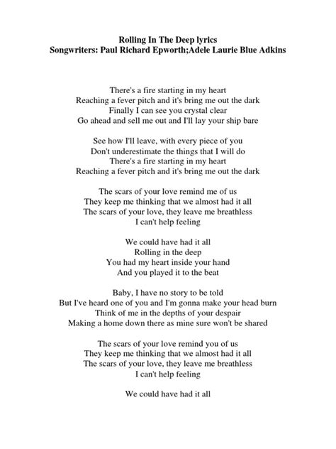 First, let’s take a look at the original English lyrics of “Rolling in the Deep.” This way, you can sing along and get a feel for the rhythm and flow of the song. Understanding the original lyrics is the first step to truly appreciating the depth of Adele’s songwriting.