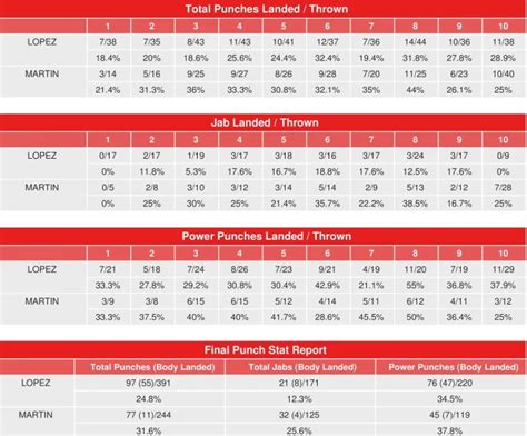 Now, let’s get into the juicy stuff: the Compubox numbers! Compubox is a system that meticulously tracks every punch thrown, landed, and missed by each fighter throughout the fight. It’s our window into the actual action, providing a granular view of the fight’s dynamics. We can see the total punches landed, the number of jabs, power punches, and the accuracy percentages for each fighter. These numbers provide the raw data, but it’s the analysis of these numbers that tells the story of the fight. Analyzing the data also requires looking at the punching accuracy , which is a percentage that determines how many punches thrown actually connected with the target. Analyzing all these aspects helps us understand the effectiveness of each fighter’s strategy and performance in the ring. Compubox data is essential because it is an objective source that highlights the punches that have landed, power punches, and accuracy percentages, helping us get a full picture of the fight.