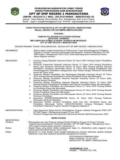 Terakhir, di bagian penutup, ada Tempat dan Tanggal Ditetapkan SK , serta Tanda Tangan Pejabat yang Berwenang (biasanya Kepala Sekolah) beserta stempel sekolah. Kadang juga ditambahkan tembusan kepada pihak-pihak terkait, seperti Ketua Yayasan (jika ada), Dewan Guru, atau bahkan Dinas Pendidikan setempat. Jadi, dengan punya SK yang isinya komplit kayak gini, acara IHT Kurikulum Merdeka di SMK kamu bakal punya landasan yang kuat dan semua orang jadi lebih paham perannya. Mantap kan?