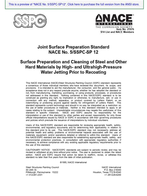 Now, let’s shift gears and talk about NACE No. 5 . This standard is actually titled High-Pressure Water Cleaning of Steel Surfaces . Sound familiar? Well, it should! NACE No. 5 is the NACE International equivalent to SSPC SP 12. Yes, you heard that right, guys. They are essentially the same standard, just published by two different organizations. NACE (National Association of Corrosion Engineers) is another major player in the corrosion and coatings industry, and they developed their own standard for high-pressure water cleaning. Over the years, SSPC and NACE have worked together more and more, and for many standards, they’ve actually jointly published them. In fact, the current version of these standards is often referred to as SSPC-SP 12 / NACE No. 5 . This joint publication signifies that both organizations agree on the content and criteria. So, when you see SSPC-SP 12 / NACE No. 5, it means you’re looking at the definitive standard for high-pressure water cleaning of steel surfaces, agreed upon by both SSPC and NACE.