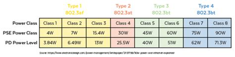 • Type 3 : Delivers up to 60 watts from the PSE, with 51 watts available at the PD. This is fantastic for things like video conferencing systems, LED lighting, and compact workstations.