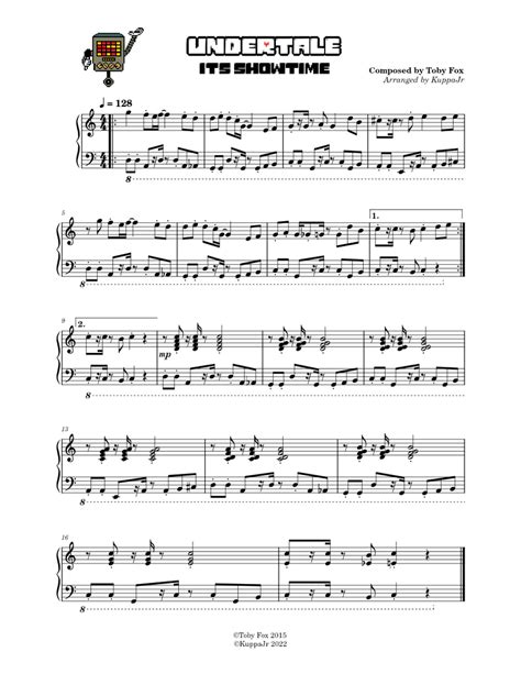 Now, let’s talk about the actual sheet music for Undertale’s “Showtime” piano version. I know, I know, for some of you, looking at a page full of dots and lines can be a bit intimidating, but trust me, it’s like learning a new language, and once you get the hang of it, it opens up a whole new world of music. If you’re new to reading music, don’t panic! We’ll cover the basics relevant to “Showtime.” First, you’ll see the treble clef (that fancy curly thing) and the bass clef (the one with two dots). The treble clef usually indicates the notes played by your right hand, and the bass clef is typically for your left hand. The notes themselves – those little ovals – tell you which key to press and for how long. The position of the note on the staff (the five lines) tells you the pitch. Higher notes are higher up on the staff, and lower notes are lower down. You’ll also encounter time signatures , usually at the beginning of the piece, like 4 4 . This tells you how many beats are in each measure and what kind of note gets one beat. For “Showtime,” understanding the rhythm is super important because it’s full of energy and has some syncopation (notes that fall off the main beat, giving it that jazzy, driving feel). Look out for note durations – whole notes (long!), half notes, quarter notes (the most common), and eighth notes (shorter!). Then there are rests , which are basically silences. Pay attention to those too; they’re just as important as the notes! Dynamics are indicated by markings like p (piano, meaning soft) and f (forte, meaning loud). “Showtime” has a huge dynamic range, so really pay attention to these markings to capture the song’s intensity. Don’t forget articulation marks like staccatos (dots above or below notes, making them short and detached) and slurs (curved lines connecting notes, indicating they should be played smoothly). If you’re unsure about a specific symbol, a quick online search or asking a more experienced musician can clear things right up. Remember, the goal isn’t to become a music theory expert overnight, but to understand enough to play “Showtime” accurately and expressively. It’s all about translating those symbols into beautiful sound!