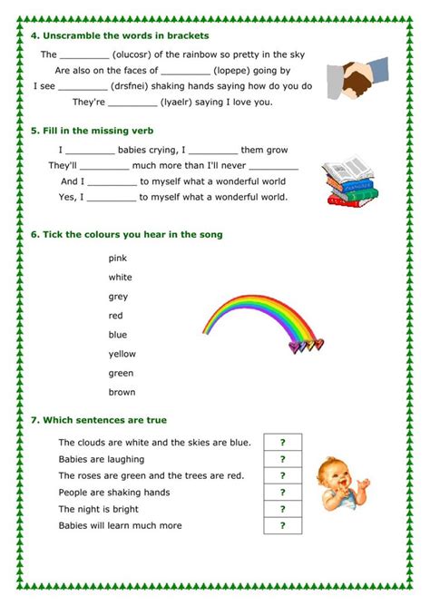 One of the most significant advantages of using Liveworksheets for “What a Wonderful World” is the ability to integrate audio and visual elements seamlessly . Think about it: the song itself is an audio experience. By embedding the actual audio track into the Liveworksheet, students can listen to Louis Armstrong’s iconic voice as they complete their tasks. This creates a direct connection between the auditory input and the learning activity. Imagine a student listening to the line “I see trees of green, red roses too” and then being prompted to drag the word “green” into a blank space or click on a picture of a green tree. This multi-sensory approach caters to different learning styles and reinforces the lyrics much more effectively than simply reading them. Furthermore, the visual aspect is just as crucial. Liveworksheets allow you to incorporate images, illustrations, and even short video clips. For “What a Wonderful World,” you can use stunning nature photography, colorful drawings of flowers, or even short clips of children playing to visually represent the song’s themes. This visual reinforcement helps solidify the meaning of the lyrics and makes the learning experience more vibrant and memorable. It transforms abstract concepts into tangible representations, making the song’s message about the beauty of the world more accessible and impactful. This integration isn’t just about making things look pretty; it’s about creating a richer, more immersive learning environment that mimics how we naturally process information – through a combination of senses. When the audio and visual components work together, they create a powerful synergy that deepens understanding and appreciation. Students aren’t just hearing words; they’re seeing the world described and feeling the emotions evoked, all within a single, interactive platform. This makes the learning process incredibly effective and genuinely enjoyable, turning a simple song into a profound lesson in observation and gratitude.