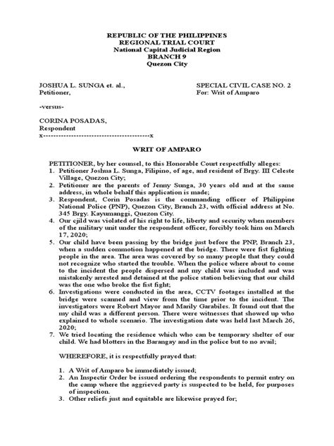 The Supreme Court, in A.M. No. 07-9-12-SC , laid down the specific rules and guidelines for the Writ of Amparo. This case is the Rosetta Stone for understanding how it works. One of the most critical aspects is its summary nature . This means it’s designed to be processed quickly. Unlike regular court cases that can drag on for years, an Amparo petition gets priority. The court has to act fast. Another key feature is the burden of proof . While generally, the person filing the case has to prove their claims, in an Amparo petition, the burden can shift. The respondent, the one accused of the violation, might have to explain their actions or lack thereof. This is crucial because often, victims of human rights abuses are in a weak position, lacking the resources or evidence to prove their case definitively. The writ also allows for interim reliefs , meaning the court can issue protective orders immediately, like directing security details, ordering disclosure of information, or even placing the petitioner under government protection, while the case is still being heard. This is what makes it so powerful – it’s not just about a future judgment; it’s about immediate protection . The rules also specify who can file the petition – the aggrieved party, or by a legal heir, or even a duly authorized representative. This ensures that even if the victim is incapacitated or missing, their rights can still be defended. The court also has the power to conduct a hearing, summon witnesses, and even visit the site of the alleged violation to gather information firsthand. It’s a comprehensive tool aimed at providing swift and effective justice.